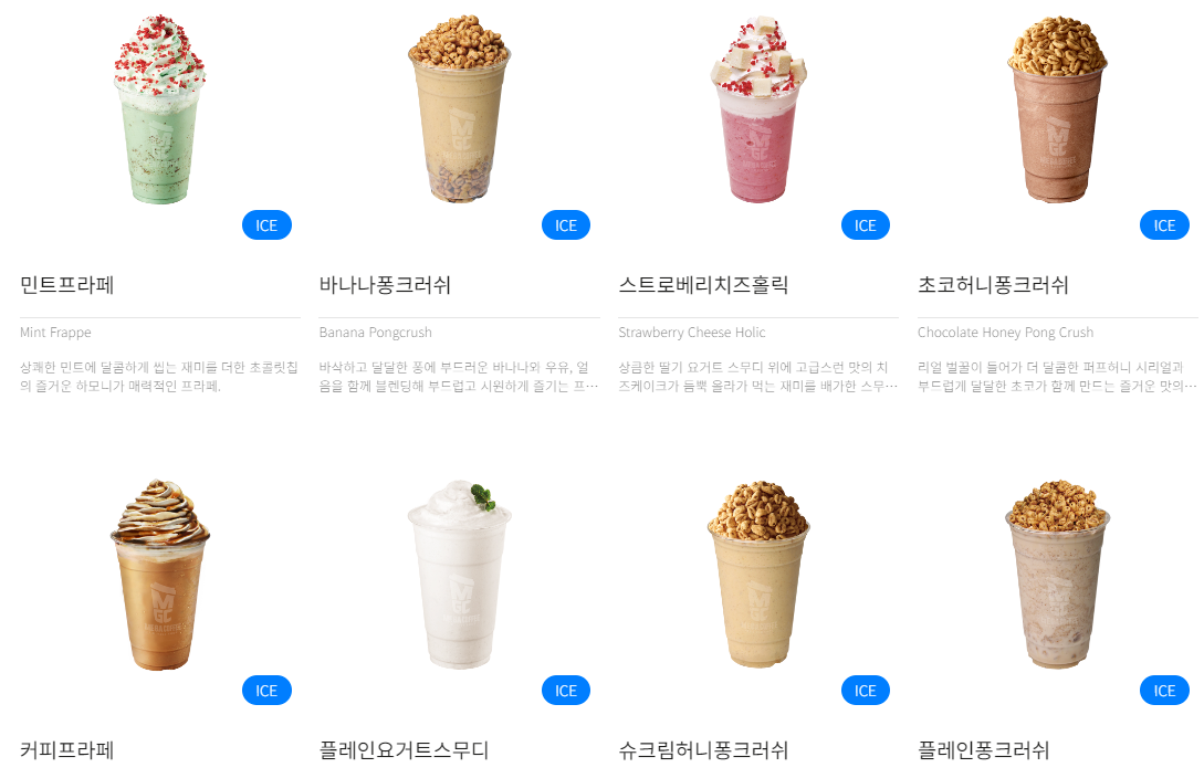 플레인퐁크러쉬: ICE 3,900원 딸기퐁크러쉬: ICE 3,900원 바나나퐁크러쉬: ICE 3,900원 초코허니퐁크러쉬: ICE 3,900원 슈크림허니퐁크러쉬: ICE 3,900원 쿠키프라페: ICE 3,900원 딸기쿠키프라페: ICE 3,900원 리얼초코프라페: ICE 3,900원 민트프라페: ICE 3,900원 커피프라페: ICE 3,900원 녹차프라페: ICE 3,900원 유니콘프라페: ICE 4,800원 |