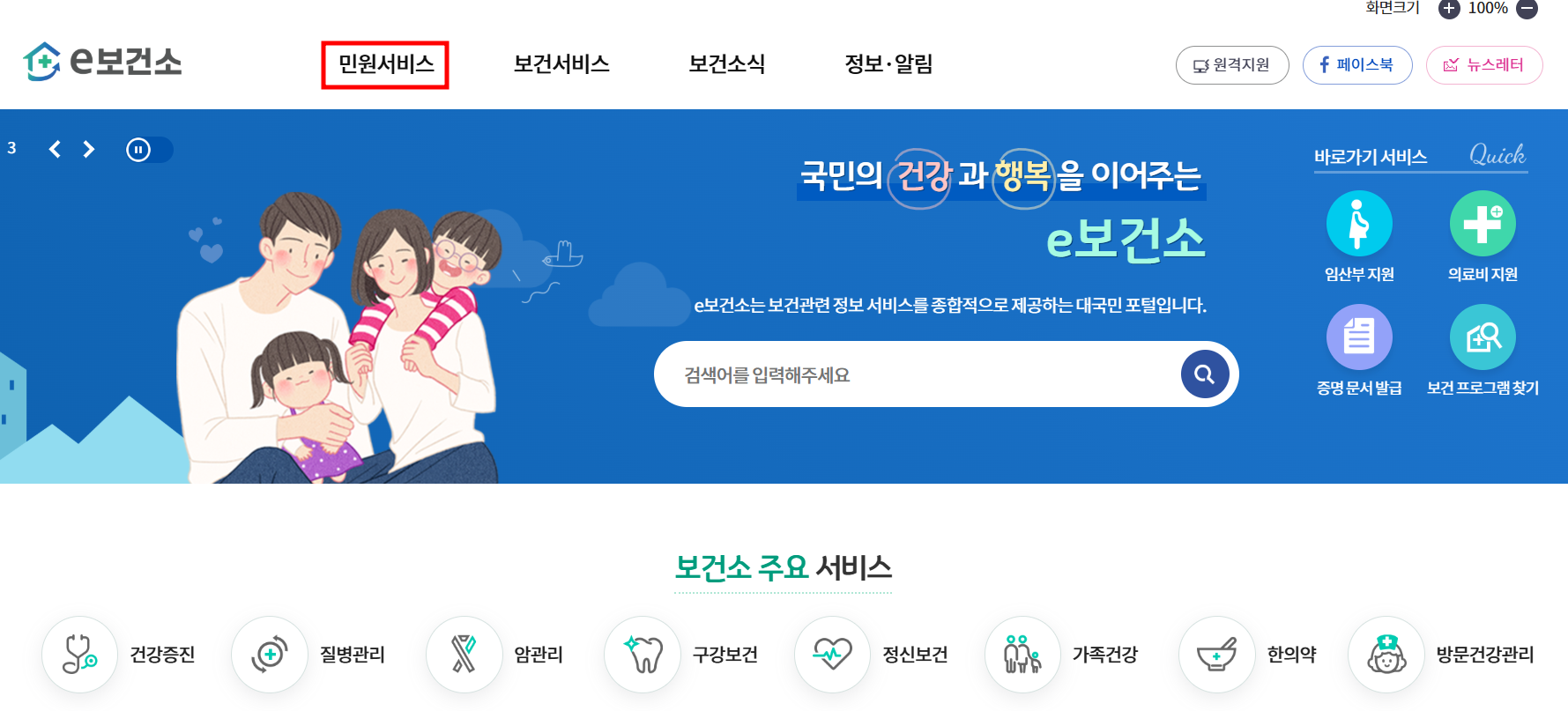 - 공공보건포털(e보건소) 또는 정부24 웹사이트에 접속합니다.